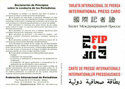A carteira internacional de jornalista é da FIJ (Federação Internacional de Jornalistas) e emitida pela FENAJ. Para obtê-la o jornalista precisa estar sindicalizado, preencher um formulário fornecido pelos Sindicatos. É necessário ainda, anexar cópia da carteira de jornalista nacional na validade e duas fotos 3x4, para a primeira vez, (uma foto no caso de renovação). O valor cobrado pela emissão da mesma, consta no formulário. Ainda para a renovação é necessário anexar cópias da carteira anterior ou o original da antiga. A carteira internacional é o documento de identificação do jornalista no exterior. Junto com a carteira, o profissional recebe uma relação das entidades filiadas à FIJ no mundo. O titular da cédula internacional tem benefícios - desconto ou gratuidade - no ingresso de cinema, museus, espetáculos, etc, que variam de país a país. Outra finalidade importante do documento é facilitar o acesso às entidades sindicais filiadas à FIJ. Dessa forma, fica mais fácil encaminhar solução de problemas que possam surgir quando o jornalista está em outro país. Por determinação da FENAJ e da FIJ – Federação Internacional dos Jornalistas, a partir do dia 18 de janeiro de 2010 o custo da carteira internacional passará dos atuais 30 euros para 40 euros. As carteiras internacionais só podem ser retiradas por profissionais sindicalizados, por determinação da FIJ. |