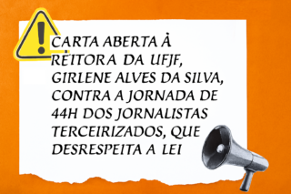 Leia mais ›CARTA ABERTA À REITORIA DA UFJF, GIRLENE ALVES DA SILVA, CONTRA A JORNADA DE 44H DOS JORNALISTAS TERCEIRIZADOS, QUE DESRESPEITA A PROFISSÃO E A LEI